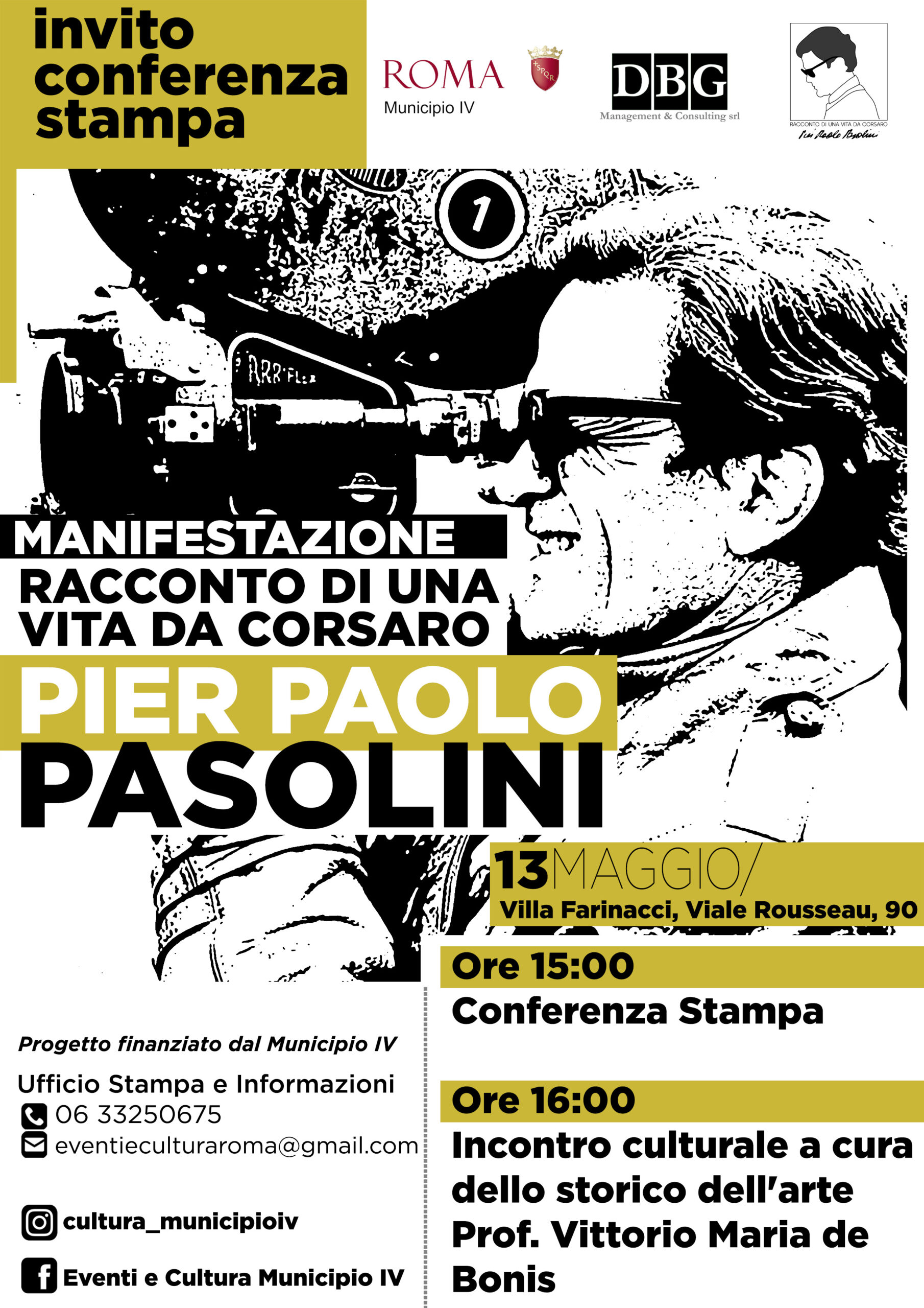 Venerdì 13 maggio, alle ore 15:00, si terrà a Roma la presentazione di “Racconto di una vita da Corsaro. Pier Paolo Pasolini”, un ciclo di eventi e appuntamenti culturali ideati da Barbara Molinario ed organizzati da DBG Management & Consulting, per celebrare i cento anni dalla nascita dell’artista. Il progetto è finanziato dal Municipio IV – Direzione Socio Educativa.